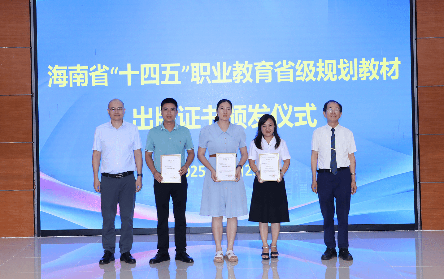 海南省教培院郑海涛院长、总主编杨铭铎教授为《海南代表面点》(龙丁育主编)《海南基础面点》(郑璋主编)以及华中科技大学出版社《餐饮食品安全》(郭利芳主编)教材编写团队代表颁发海南省“十四五”职业教育省级规划教材出版证书。