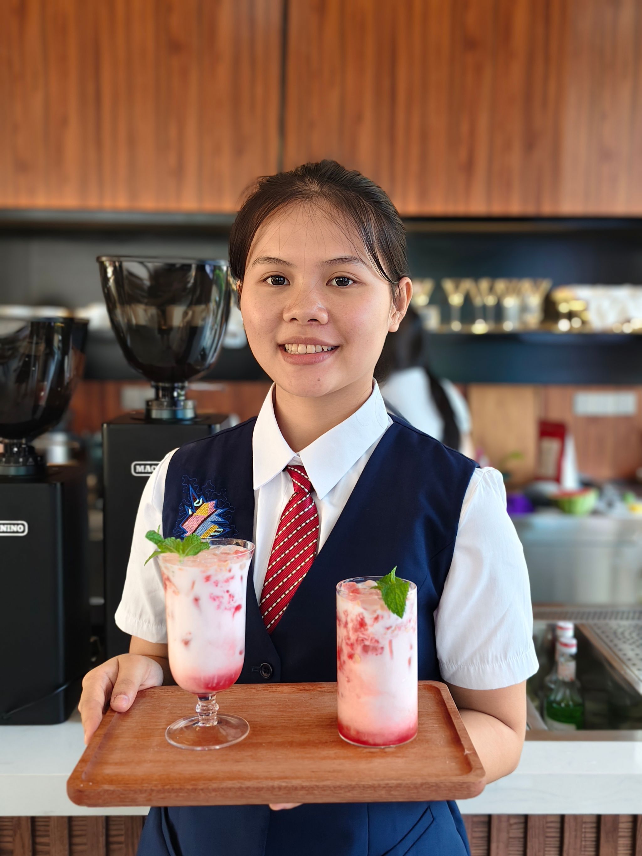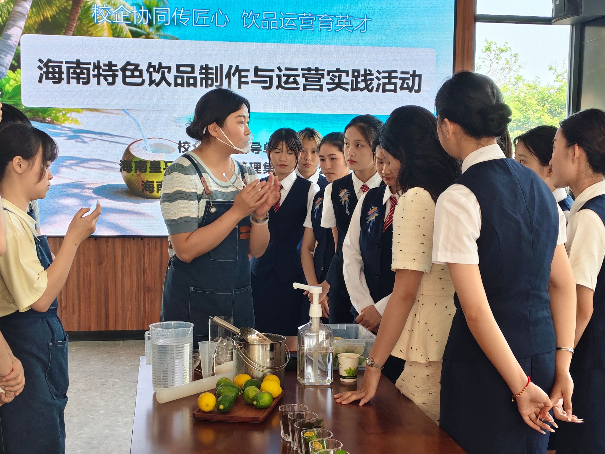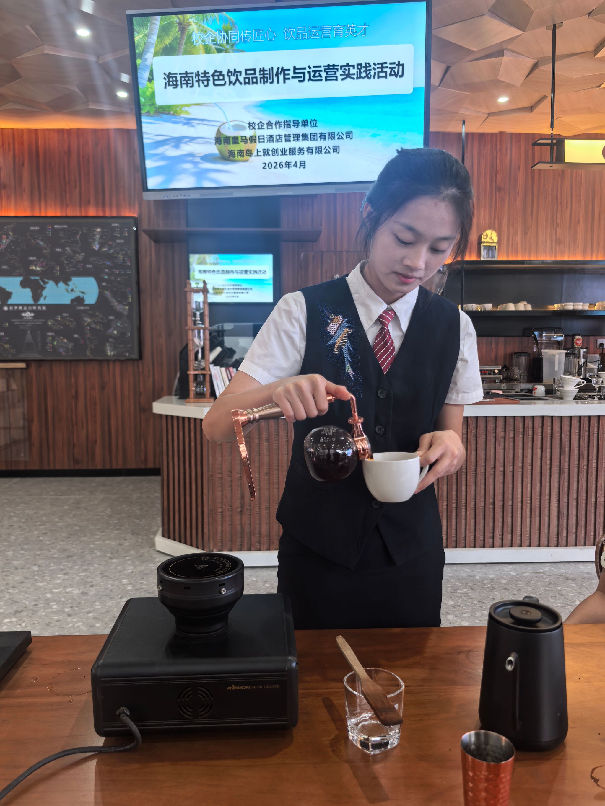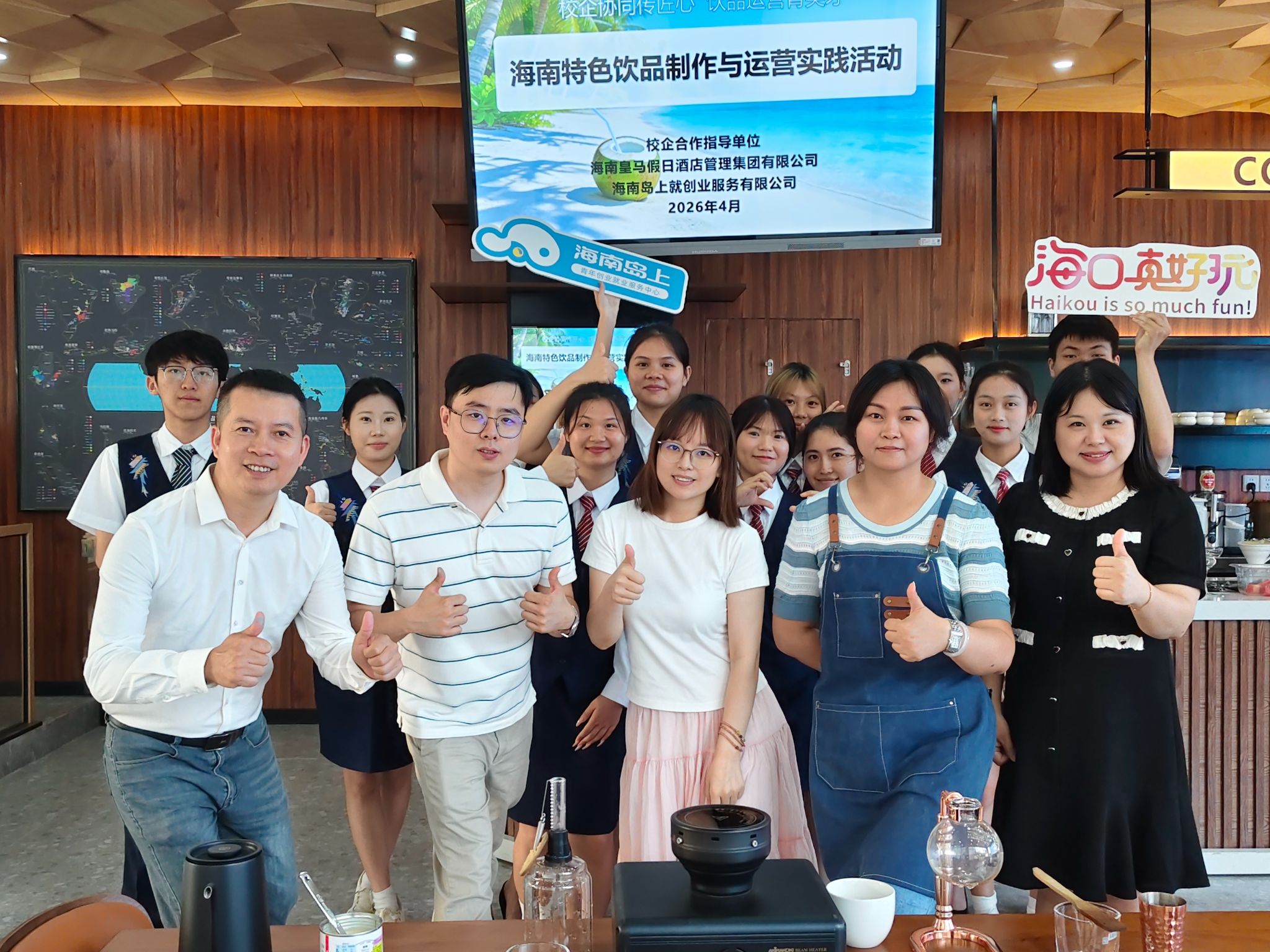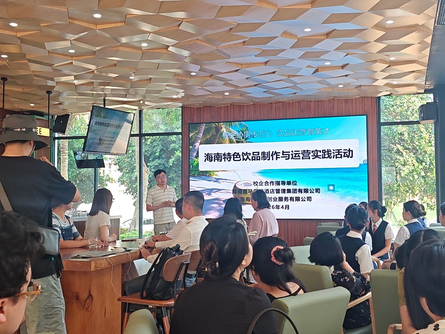 为深化产教融合、校企协同育人,将海南本土饮品文化与专业教学紧密结合,提升学生实践技能与职业素养。2026年4月14日,国际旅游学院特邀校企合作单位海南皇马假日酒店管理集团有限公司,开展以“校企协同传匠心,饮品运营育英才”为主题的实践活动。